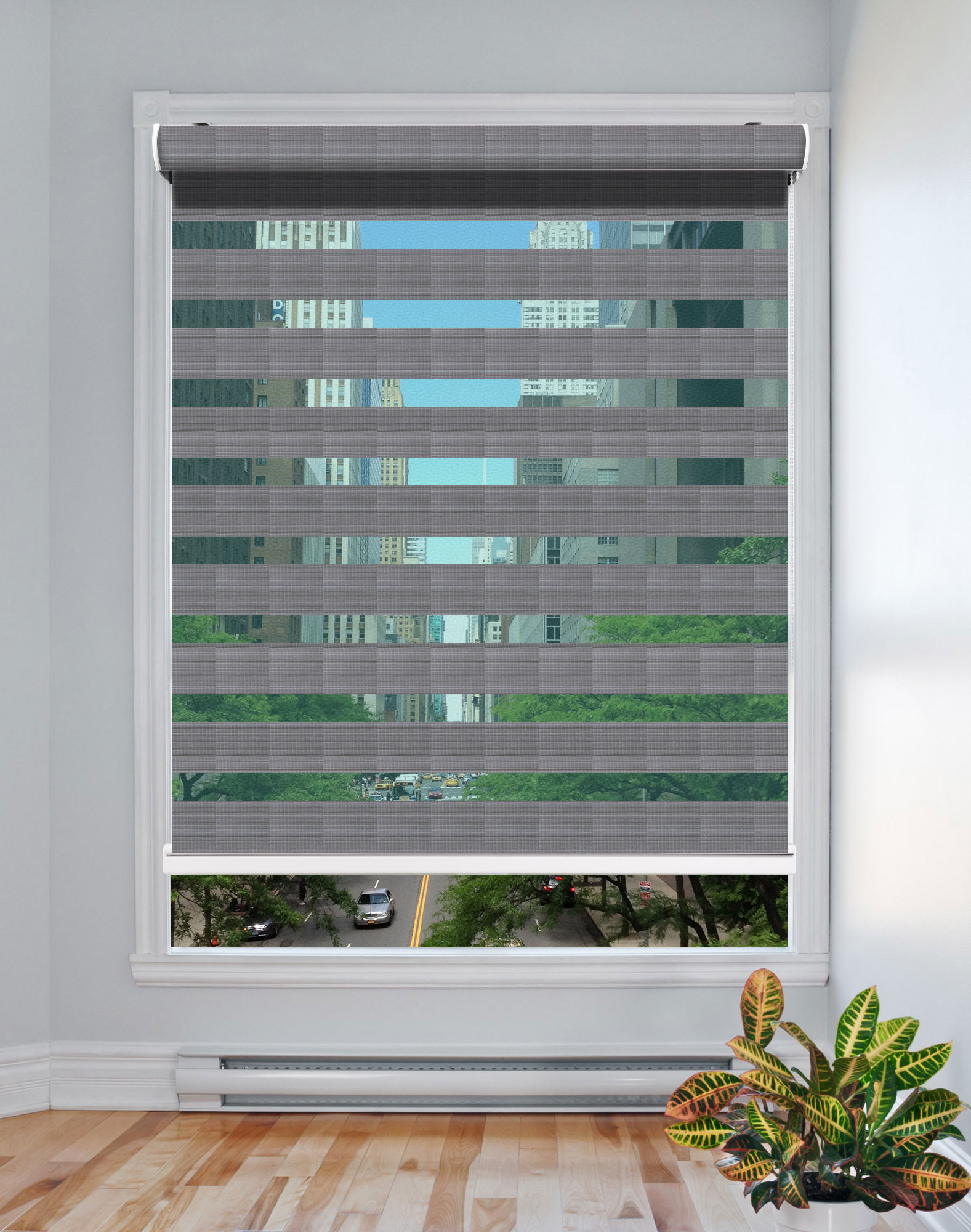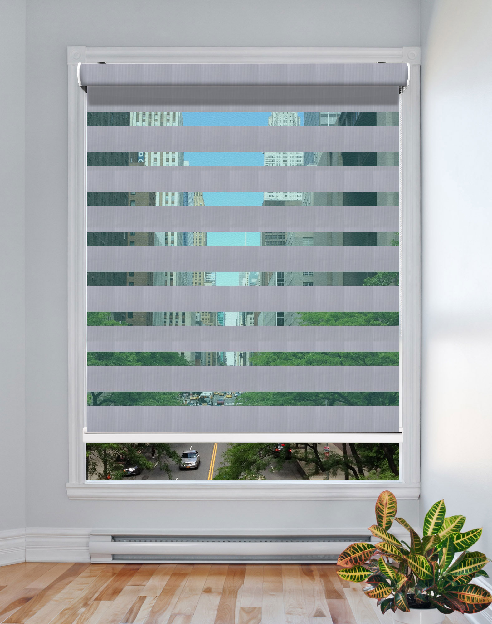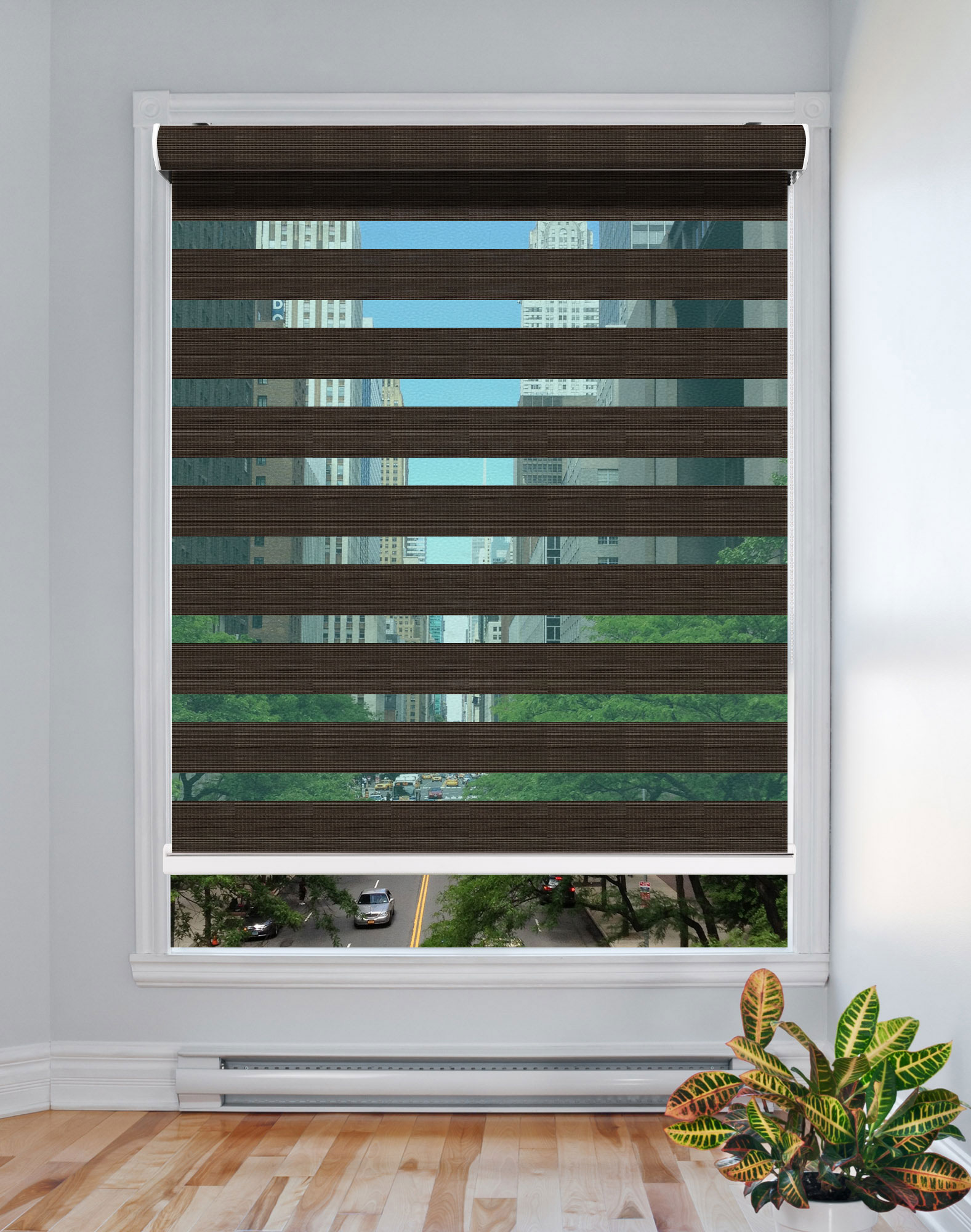 The Zebra Shade is the latest style of Window coverings where the striped fabric across two layers alternatively creates the open and closed effects. When raised, they stack compactly, giving you a clear, unobstructed view.