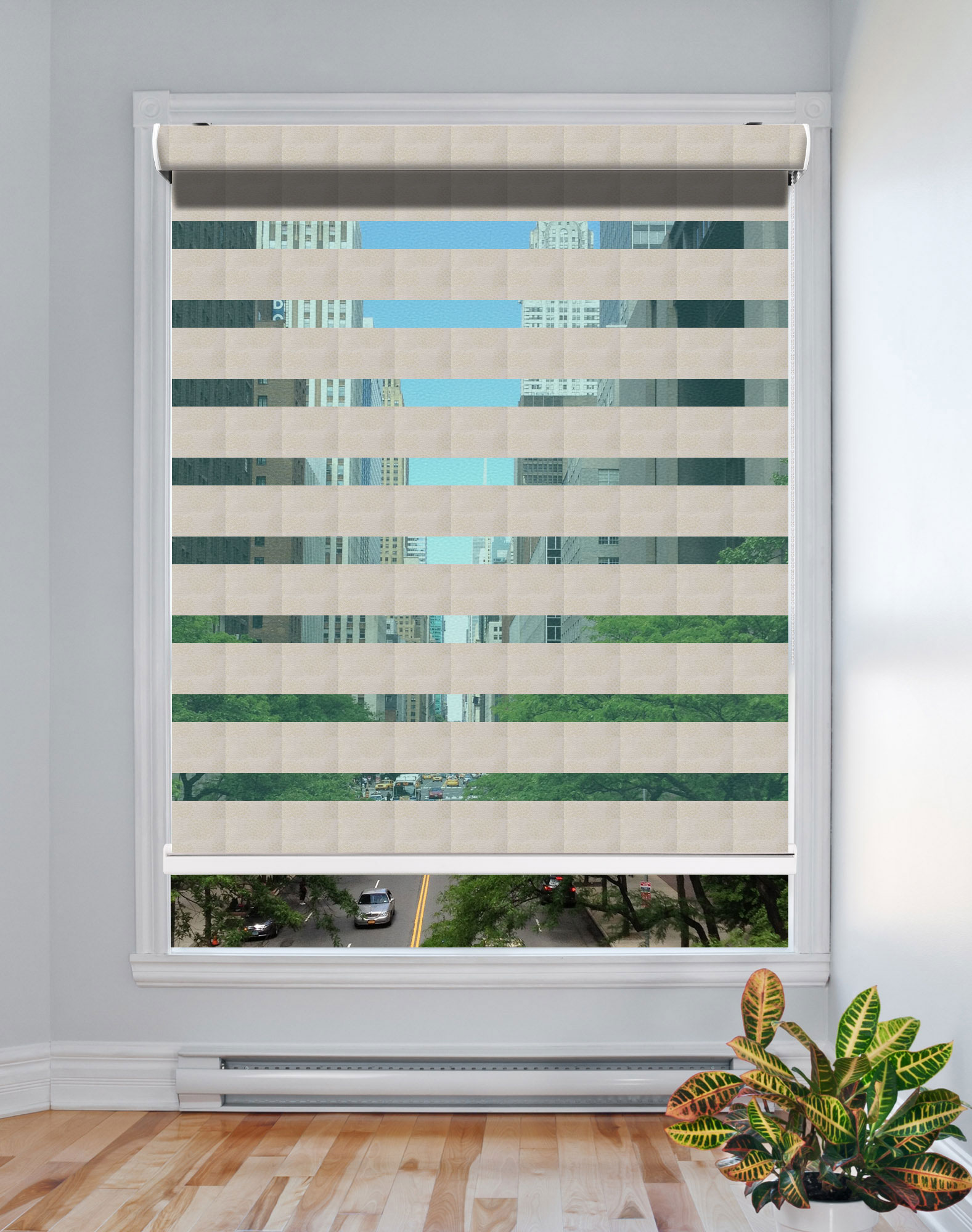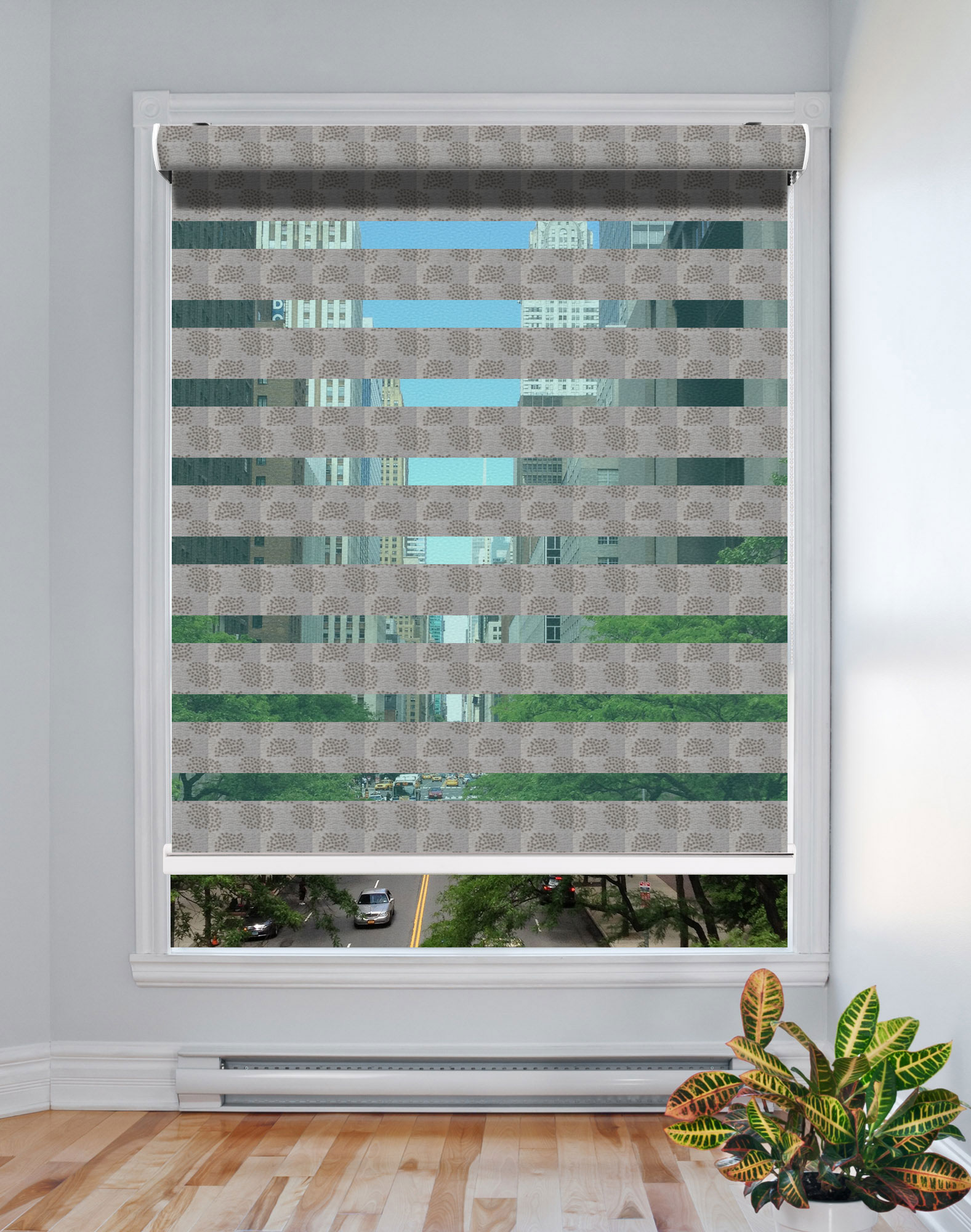 The Zebra Shade is the latest style of Window coverings where the striped fabric across two layers alternatively creates the open and closed effects. When raised, they stack compactly, giving you a clear, unobstructed view.
