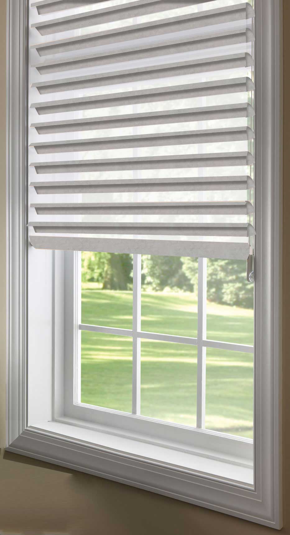 Horizontal Fabric Louvers are opaque and the front and rear fabric facing is sheer.