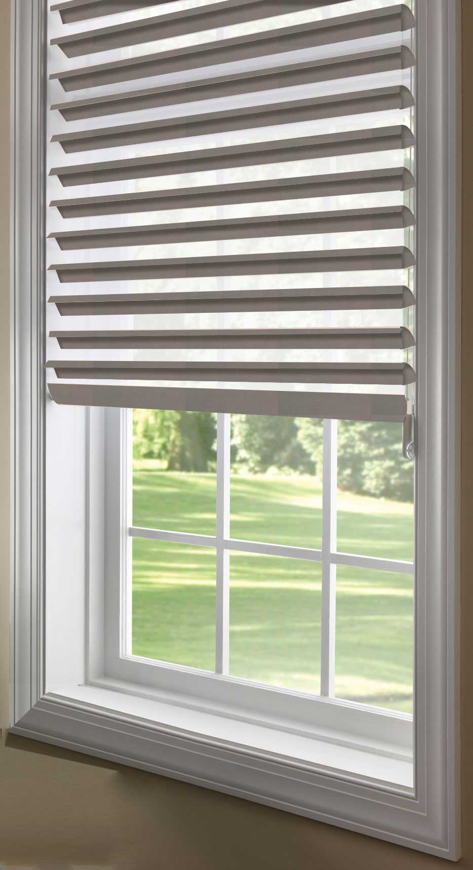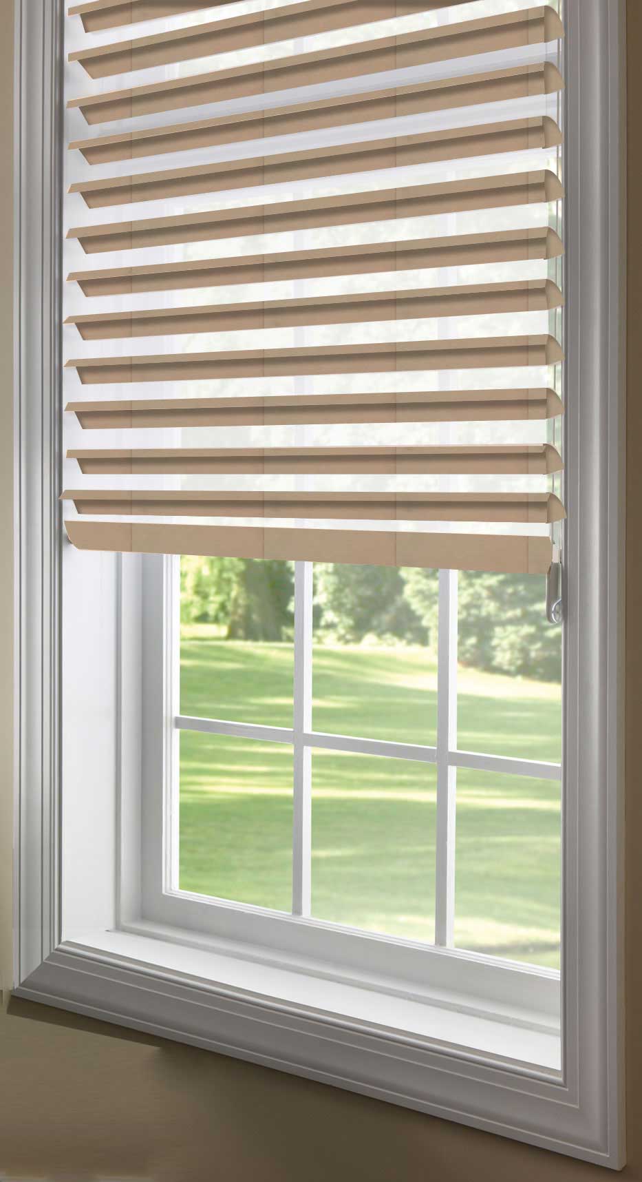 The 2\" window shadings will cut out the direct sunlight while still filling the room with a glowing subtle light. They have the functionality of a blind with the soft look of draperies. The louvers can be rotated to different angles to adjust the light and the view or you can lift them all the way up to the top of the window where they virtually disappear into the headrail. The control is a continuous loop cord which lifts and lowers the shade. The cord always remains the same length unlike other types of window blinds that have a lift cord that gets longer hanging on the floor when the blind is lifted. With the continuous loop control the shade can be stopped in any height position that you want it at.