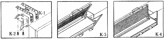 Attach angular supports to wall or frame. Two supports are needed for each bracket (K-1) Attach the bracket, placing screws through the top of the bracket and through the angular support (K-2) Attach shade to bracket by placing front edge of the headrail into front bracket lip (K-3) Push back of headrail up into the back of the bracket until the headrail snaps securely into place (K-4)