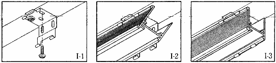 Place screws through top of bracket and secure to casting or ceiling (I-1) Attach shade to brackets by placing front edge of headrail into the front bracket lip (I-2) Push back of headrail up into the back of the bracket lip until the headrail snaps securely into place (I-3)
