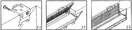 Place screws through top of bracket and secure to wall or frame (J-1) Attach shade to brackets by placing front edge of headrail into the front bracket lip (J-2) Push back of headrail up into the back of the bracket lip until the headrail snaps securely into place (J-3)